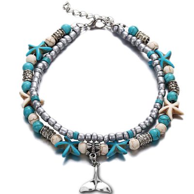 De zomer is in aantocht en dus ook die heerlijke stranddagen. Hoe leuk is het om er tip top uit te zien als je heerlijk in de zon ligt, daar bij die hippe loungetent of gewoon lekker op je handdoekje in het warme zand. Met dit dubbellaags enkelbandje zeester met zeemeermin bedel zie je er zo sexy uit op het strand. De bovenste laag van dit dubbellaags enkelbandje zeester met zeemeermin bedel bestaat voornamelijk uit zilverkleurige kraaltjes afgewisseld met hier en daar een turquoise kraaltje. De onderste laag bestaat uit witte en turquoise kraaltjes afgewisseld met metalen schakeltjes en zeesterretjes met in het midden een metalen bedeltje in de vorm van een schelp. Dit enkelbandje zeester met zeemeermin bedel zorgt er voor dat je strandoutfit compleet zal zijn en je stralend over het strand zal paraderen.
